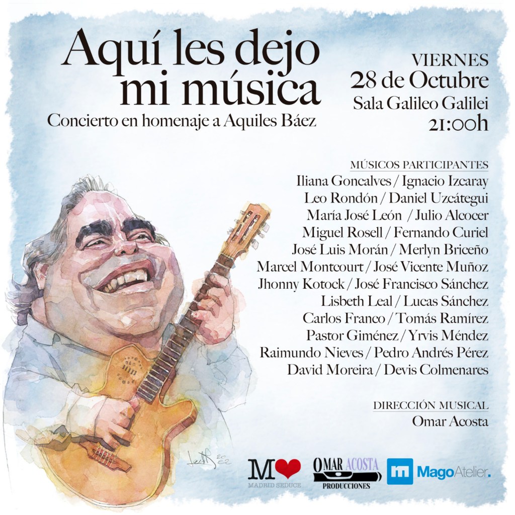 En este concierto homenaje, músicos, amigos y compañeros, harán ese viaje musical a través de un repertorio construido con virtuosismo y pasión. Son muchos los que aprendieron, tocaron, compartieron y disfrutaron con el talento y la genialidad de Aquiles Báez. En Madrid, se reunirán en escena para honrar su música. Sean todos bienvenidos.