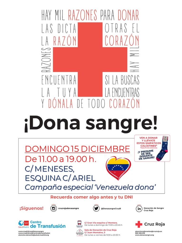 La Unidad de Extracción de Sangre de Cruz Roja en Madrid en colaboración con el Centro de Transfusión de Sangre de la capital española han organizado la iniciativa “Venezuela dona”, una campaña especial de donación de sangre dirigida en particular a todos los venezolanos residentes en Madrid. El objetivo de la campaña es afianzar los lazos que unen a los venezolanos y a los madrileños, en una época como la navideña en la que actos de solidaridad como este se hacen más frecuentes.